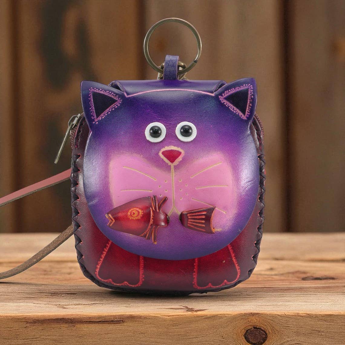 Experience the craftsmanship of Sunflower Handmade Leather Inc with our E502 Leather Cat Wristlet Coin Purse Wallet. This unique accessory, designed with an artistic 3D leather design, is perfect for keeping your coins and cards. Its custom coloring and hand tooling reflect our commitment to the highest standards of materials and workmanship. Please note, as each piece is handmade, color and shape can slightly vary, making each coin purse a distinctive piece. Add this unique piece to your collection today.