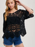 This playful open-knit crochet lace top features a flirty scoop neck and dramatic 3/4 bell sleeves that bring a whimsical vibe to any outfit. Perfect as an oversized beach cover-up or layered over your favorite tank for a fun, everyday look.